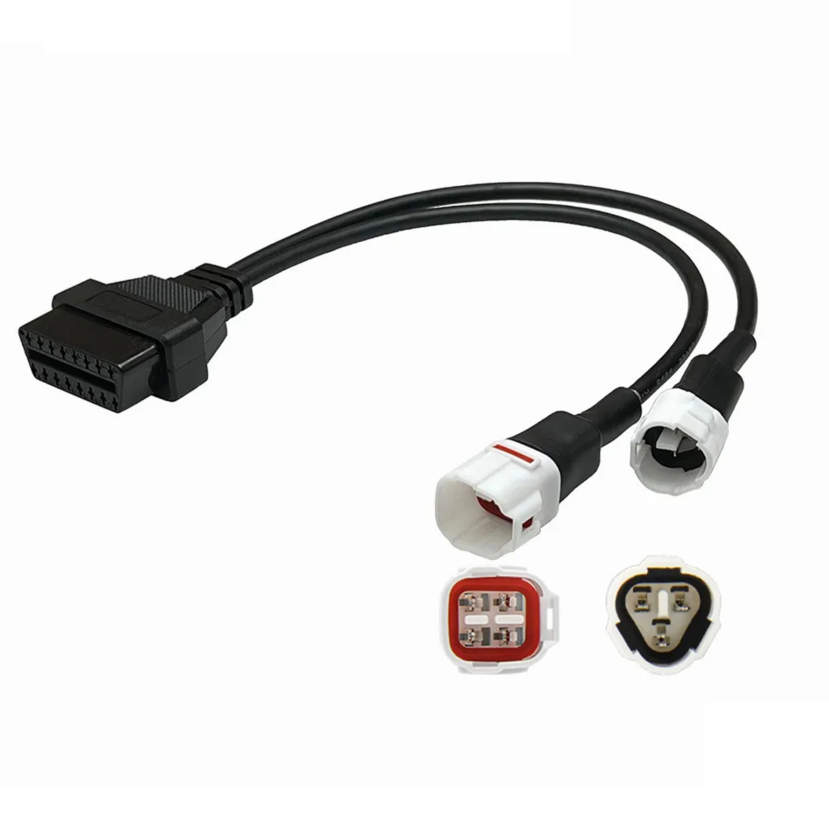 Disponível nas versões 3+4 Pinos, o adaptador conecta a porta de diagnóstico da moto ao scanner OBD2 padrão de 16 pinos, sem necessidade de modificações.